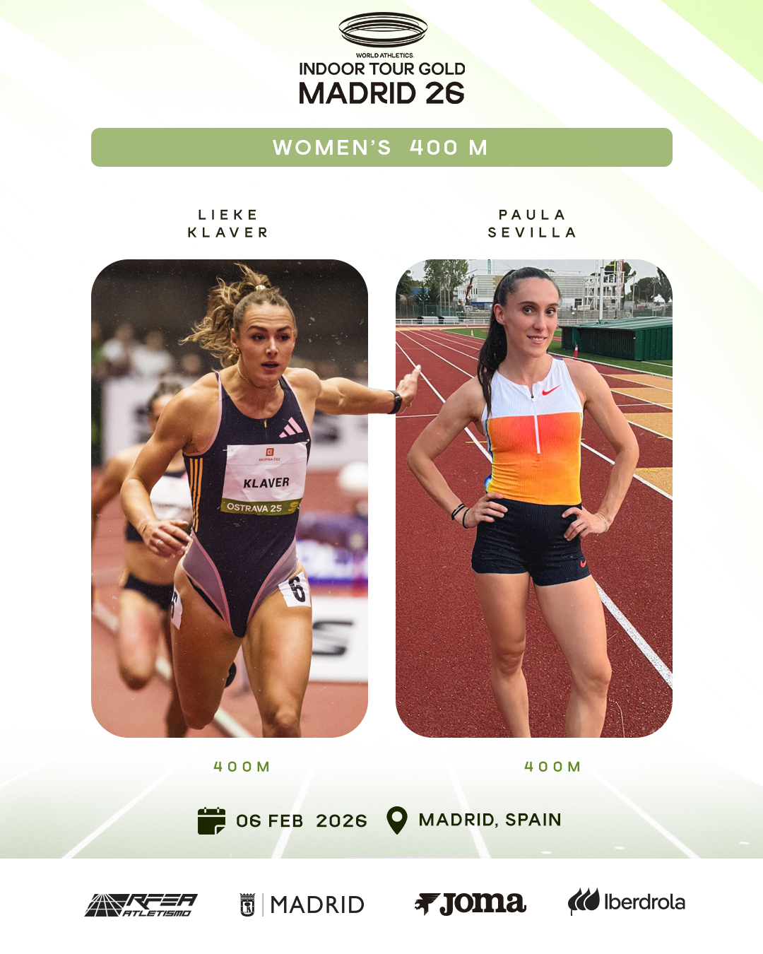 La vigente campeona de Europa de 400 metros indoor, la neerlandesa Lieke Klaver, se medirá a la plusmarquista española de la distancia, Paula Sevilla. Ambas reeditarán la final del Europeo de Apeldoorn 2025, donde Klaver logró la mejor marca continental del año (50.38) para ganar su primer título y Sevilla batió el récord de España (50.99) para colgarse el bronce.